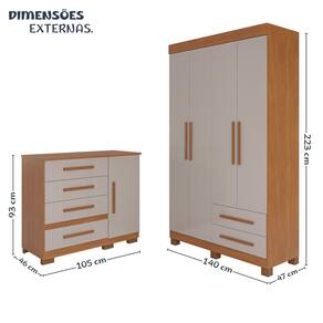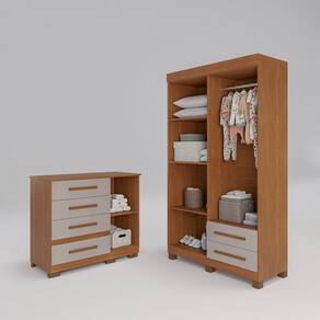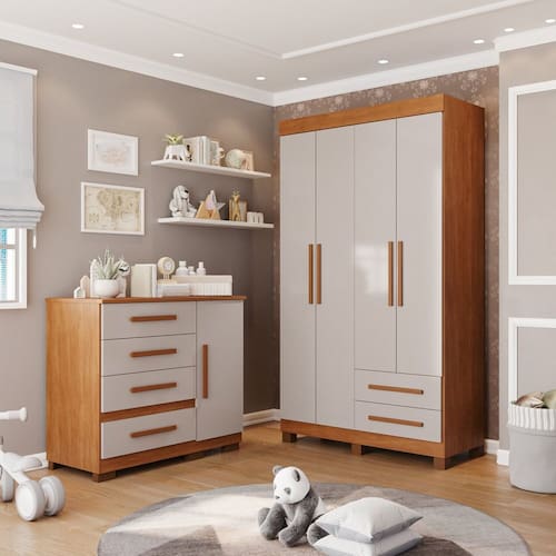 Este conjunto de quarto infantil oferece praticidade e charme para o dia a dia. Composto por um guarda-roupa de 4 portas e 2 gavetas, e uma cômoda com 4 gavetas, 1 porta e 1 prateleira, garante espaço de sobra para manter tudo organizado. Os puxadores em MDF proporcionam um toque moderno e resistente, enquanto as corrediças telescópicas asseguram abertura suave. O cabideiro em alumínio no roupeiro e os pés em PVC em ambos os móveis completam o conjunto com durabilidade e funcionalidade, ideal para acompanhar todas as fases da infância. Ambiente Principal: Quarto Infantil codigo_ean: 7900288214683 Complexidade da Montagem: Alta: deve ser montado por um montador especializado Cor: Cinamomo / Off White Cor do Produto: Cinamomo / Off White Escala de Brilho: Semi-Fosco Linha ou Coleção: Aurora Manual de Montagem e Instalação: https://cdn2.madeiramadeira.com.br/atributo/benetil-moveis/3102773-4938-17537964864751.pdf Marca: Espresso Móveis Material Principal: MDP Medida de Cada Item: Roupeiro: Altura; 223cm / Largura; 140cm / Profundidade; 47cm. Cômoda: Altura; 93cm / Largura; 105cm / Profundidade; 46cm modular: Não Necessita Montagem: Sim Origem do Produto: Nacional Peso: 35 Recomendações de Uso, Manutenção e Limpeza: Limpeza com pano macio e levemente umedecido. Não utilizar solventes a base e de inflamáveis. Não utilizar produtos abrasivos. Sistema de Montagem: Parafusos e cavilhas Suporta Até (kg): 50
