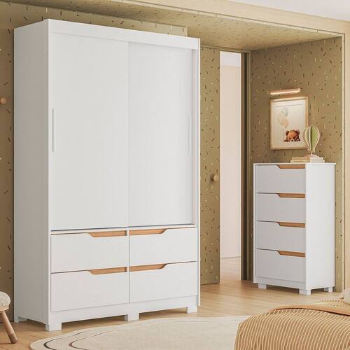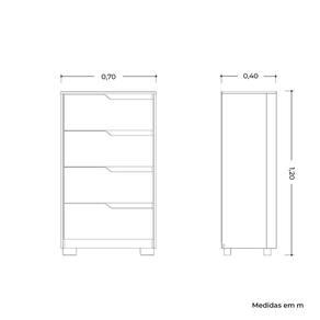 A cômoda complementa o conjunto com design funcional, contando também 04 gavetas com corrediças telescópicas e puxadores cava, interior 100% na cor do produto e reforço estrutural no fundo das gavetas, proporcionando mais durabilidade e resistência no uso diário. Também acompanha pés.