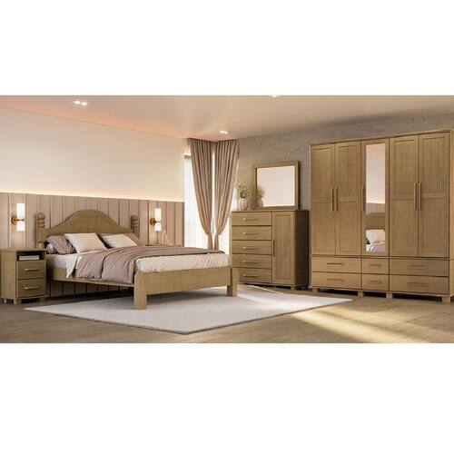 Conjunto Quarto Ouro: Guarda-Roupa 5 Portas, Cama Casal, Cômoda Sapateira e 2 Mesas Cabeceiras Freijó Madeira Pinus