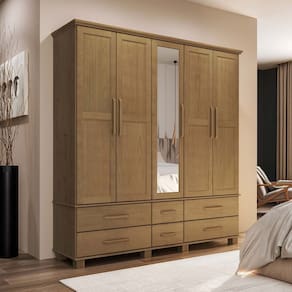 Conjunto Quarto Ouro: Guarda-Roupa 5 Portas, Cama Casal, Cômoda Sapateira e 2 Mesas Cabeceiras Freijó Madeira Pinus