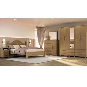 Conteúdo das Embalagens: 1 Cômoda, 1 Guarda-Roupa, 1 Cama Queen, 2 Mesas de Cabeceira,