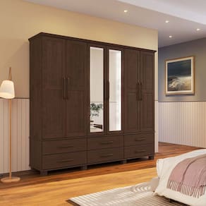 Conjunto Quarto Ouro: Guarda-Roupa 6 Portas, Cama Casal, Cômoda Sapateira e 2 Mesas Cabeceiras Café Madeira Pinus