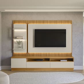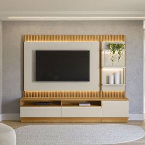 Fabricado em MDP e MDF, o Conjunto Saint Paul conta com acabamentos de alta qualidade, como puxadores metálicos embutidos, portas com dobradiças amortecidas e luminárias de LED que destacam o espaço e criam um ambiente aconchegante. O painel com detalhe ripado acrescenta um toque contemporâneo à sua sala de estar.