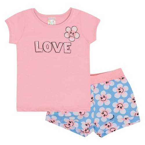 Para alegrar ainda mais a sua pequena a Pulla Bulla trouxe essa Blusa confeccionada em Meia malha na cor Rosa lumi com a estampa “Amor” bordada em Paetê, e um shorts confeccionado em Cotton leve na cor Azul turquesa com estampa rotativa de flores alegres. Esse é o conjunto perfeito para proporcionar conforto e beleza para seu amorzinho.\n