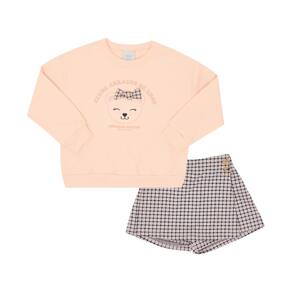 O passeio ao shopping com a dinda irá se tornar um desfile para sua pequena fashionista. O conjunto possuí short saia xadrez rosê com elastano na cintura para maior conforto, o blusão moletom na cor rosa pó possuí aplique interativo bordado de ursinha. É ou não uma graça esse conjunto?!\n
