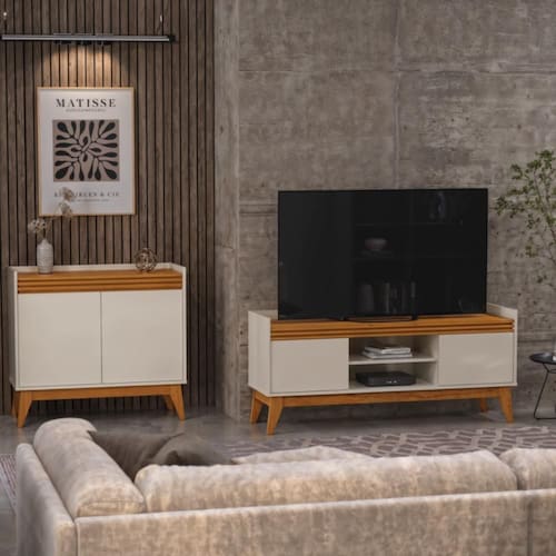 Nosso conjunto Astúrias veio para te surpreender, com uma ótima qualidade e um designer sofisticado! Nosso conjunto é composto pelo rack Astúrias que comporta uma TV de até 50 polegadas, fabricado em MDP/MDF, uma prateleira ideal para eletrônicos e objetos de decoração, com ripado frontal, portas articuladas, pés retro em MDF e pintura UV e um lindo Buffet com estrutura em MDP, portas articuladas, prateleiras internas, tampo superior com acabamento ripado, portas em MDF e pintura UV. Surpreendente não acha?!