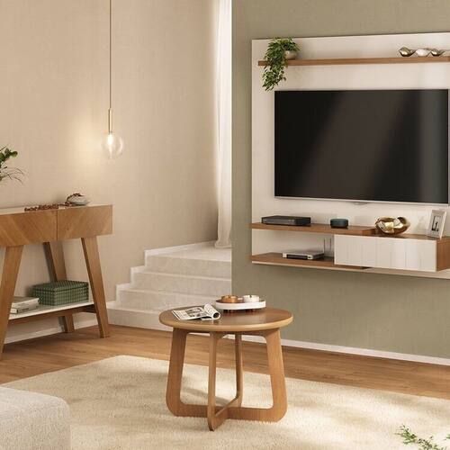 Charme e Funcionalidade em um Painel Único! Painel de Parede para TV até 55 Polegadas: Sofisticação em proporções perfeitas. Nicho com Porta Basculante: Espaço versátil e discreto. Inclui Suporte Universal para TV: Instalação fácil e segura. Passa-Fio Integrado: Organização sem esforço para seus cabos. Prateleira Superior para Decoração: Um toque pessoal ao seu ambiente. Complemente Sua Decoração com Estilo: Mais do que um suporte, uma peça de destaque. Este painel para TV não apenas suporta sua tela, mas eleva sua experiência visual. Com um nicho discreto e uma porta basculante, oferece espaço versátil para guardar itens diversos. O suporte universal para TV garante a instalação segura, enquanto o passa-fio integrado mantém a organização dos cabos. Acabamento: Pintura UV Altura do Conjunto: 120 cm Ambiente: null Ambiente Principal: Sala de Estar Cor: Cinamomo/Off White Informação Complementar: 1x Mesa de Centro 100% MDF Jasmin Cinamomo Largura: 59 cm Altura: 46,5 cm Peso: 6,6 kg Profundidade: 59 cm Necessita Montagem: Sim
