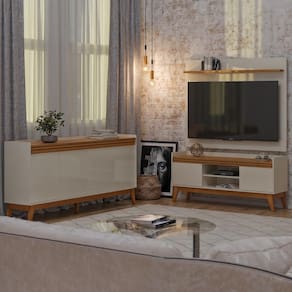 Com um designer moderno e sofisticado ele acompanha um Painel para Tv de até 50 polegadas desenvolvido em MDP, Pintura UV, 1 prateleira superior de 25mm e furação passa fio, composto também por nosso Rack que possui um tampo em MDP de 25mm, pé em MDF e 2 portas, já o nosso Buffet é encantador com uma estrutura em MDP, 4 portas articuladas em MDF, 2 prateleiras internas, tampo superior com acabamento ripado frontal, e pintura UV.