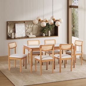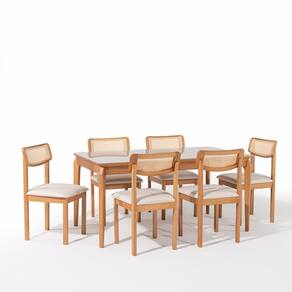 Desenvolvida para quem deseja mais acolhimento no décor, o conjunto Florença é Perfeito. Ele é composto por 6 cadeiras com encosto de telinha e 1 mesa de tampo laminado com encabeçamento em madeira maciça com vidro na cor off white de 1,60. Por ser produzida com madeira maciça de eucalipto reflorestado e acabamento Verniz mel, juntamente com o tecido claro na cor cru 06 , proporciona um ambiente com estilo luminoso, arejado e acolhedor. É Ideal para sua cozinha e sala de jantar, formando um ambiente de bem estar perfeito para desfrutar junto de família e amigos uma refeição maravilhosa. Medida da Mesa (A x L x P): 76 x 160 x 90 Peso da Mesa: 30 kg Mesa suporta até: 50 kg Acabamento da Cadeira/Banco: Verniz Natural Acabamento da Mesa: Verniz Ambiente Principal: Sala de Jantar Cadeira/Banco Estofada: Somente Assento Estofado Cadeira/Banco estofada: Somente Assento Estofado Cadeira/Banco suporta até: 120 kg Cadeira/Banco Suporta Até: 120.0000 codigo_ean: 7900288285423 Complexidade da Montagem: Baixa: pode ser montado por uma pessoa sozinha Cor: Verniz Mel/Off White/Cru Cor do Produto: Verniz Mel/Off White/Cru Cor Secundária: Bege De Canto (Canto Alemão): Não Escala de Brilho: Semi-Brilho Espessura do Tampo: 35 mm Estrutura do Assento: MDF/Espuma Formato do Tampo: Retangular Informações Complementares: Este produto foi pensado e desenvolvido para elevar a decoração do seu ambiente interno e trazer um ar de sofisticação para sua sala de jantar. É recomendado seguir as instruções de manutenção e acabamento que acompanham a embalagem. Itens Inclusos: 1 Mesa, 6 Cadeiras, Kit Ferragem e Manual de Montagem Linha ou Coleção: Florença Manual de Especificação Técnica: https://product-hub-prd.madeiramadeira.com.br/476737676/documents/b9a7c24a-5dfa-4edb-b87d-78179d2da9593309704293217621799814252.pdf Manual de Montagem e Instalação: https://product-hub-prd.madeiramadeira.com.br/476737676/documents/78440003-3824-4013-b672-9d526488abed3309705293217621801470834.pdf Marca: Casa e Jardim Móveis Material da Base da Mesa: MDF/Madeira Maciça Material da Estrutura da Cadeira: Madeira Maciça Material do Tampo: Vidro/MDF Medida da Cadeira/Banco (A x L x P): 88 x 48 x 51 Medida do Tampo (L x C x E): 160 x 90 x 3,5 Mesa Extensível: Não Necessita Montagem: Sim Origem do Produto: Nacional Peso da Cadeira/Banco: 6,5 kg Possui Apoio Para os Pés: Não Quantidade de Cadeiras: 6 Quantidade de Lugares: 06 Recomendações de Uso, Manutenção e Limpeza: Utilizar em ambiente interno ,coberto. Os tampos das mesas são de MDF com encabeçamento em madeira maciça, evite molhar ou deixar líquidos por muito tempo para que não ocorra bolhas.o expor ao sol e chuva. Cuidados e limpeza : Retire o pó com uma flanela macia, seca ou levemente umedecida. Passe uma esponja macia e levemente umedecida. Não utilizar álcool ou produtos químicos, abrasivos ou solventes. Sistema de Montagem: parafusos , mas somente a mesa, as cadeiras já vão montadas