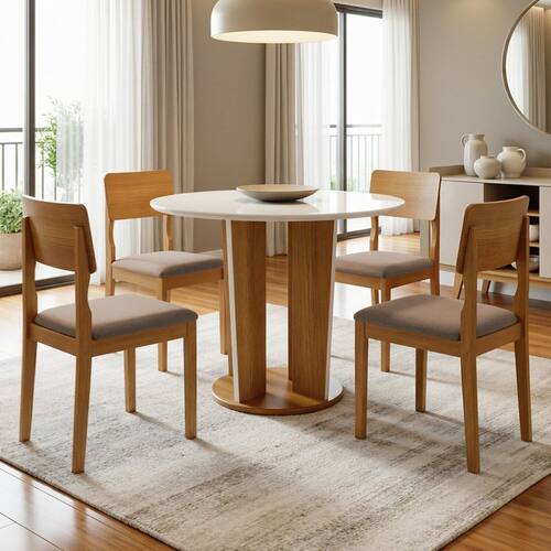A mesa redonda possui base com design moderno, trazendo personalidade ao ambiente, enquanto o tampo de vidro conta com bordas chanfradas e laqueadas, acabamento que valoriza o visual e garante um toque mais sofisticado. As cadeiras com pés em madeira reflorestada oferecem resistência e segurança, além de assento confortável para refeições mais agradáveis. Um conjunto funcional, versátil e perfeito para compor salas de jantar modernas.