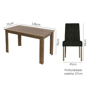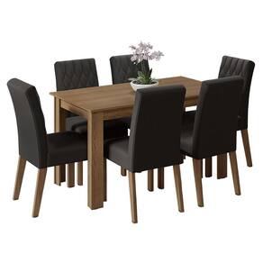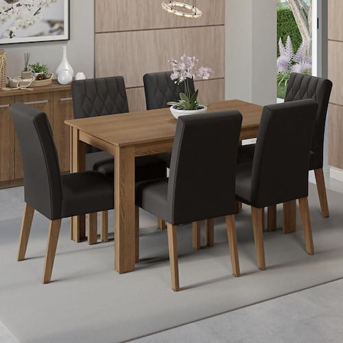 Com o tampo da mesa em madeira e acabamento amadeirado Rustic, ganha ainda mais destaque com seis cadeiras estofadas com tecido Oxford, uma escolha moderna e versátil.