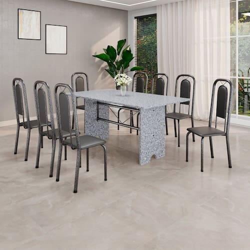 Quer deixar sua casa completa e prática? Uma dica bacana de como transformar o seu lar, deixando-o mais receptivo e bonito? Então você precisa de móveis indispensáveis para deixar seu lar muito mais aconchegante, receptivo e sempre disponível para receber a visita de amigos, familiares e convidados. Você vai se apaixonar por este incrível e moderno Conjunto de Mesa com 8 Cadeiras. Ideal para cozinha, ele é a melhor opção para completar o espaço que você desejar. Aproveite!! Medida da Mesa (A x L x P): 75,8 cm x 180 cm x 75 cm Peso da Mesa: 104,24 kg Mesa suporta até: 10.0000 Acabamento da Cadeira/Banco: Pintura Texturizada Acabamento da Mesa: Pintura Texturizada Ambiente Principal: Cozinha Cadeira/Banco Estofada: Encosto e Assento Estofados Cadeira/Banco estofada: Encosto e Assento Estofados Cadeira/Banco suporta até: 120.0000 codigo_ean: 7900288152848 Complexidade da Montagem: Baixa: pode ser montado por uma pessoa sozinha Cor: Preto / Prata Cor do Produto: Preto / Prata Cor Secundária: Cinza De Canto (Canto Alemão): Não Enchimento do Assento: Espuma D-16 Escala de Brilho: Brilhante Espessura do Tampo: 1,5 mm Estrutura do Assento: MDP Formato do Tampo: Retangular Itens Inclusos: 1 Mesa, 8 Cadeiras, Manual de Montagem e Kit Ferragens Linha ou Coleção: Lara Manual de Montagem e Instalação: https://product-hub-prd.madeiramadeira.com.br/303010228/documents/06dc3db5-7575-44c8-9d37-39ecd27527d280282374535281744236778593.pdf Marca: Soma Móveis Material da Base da Mesa: Aço Material da Estrutura da Cadeira: Aço Material do Tampo: Granito Material Principal: Madeira Medida da Cadeira/Banco (A x L x P): 105 cm x 37 cm x 40 cm Medida do Tampo (L x C x E): 180cm x 75cm x 1,5 cm Mesa Extensível: Não Necessita Montagem: Sim Origem do Produto: Nacional Peso da Cadeira/Banco: 2,7 kg Possui Apoio Para os Pés: Não Possui Suporte Giratório: Não Quantidade de Cadeiras: 8 Quantidade de Lugares: 08 Recomendações de Uso, Manutenção e Limpeza: Não permitir que molhe os pés da base, usar um pano de tecido macio e seco, evitar detergentes, alvejantes e produtos químicos de limpeza; no tampo usar tecido macio levemente umedecido. Revestimento da Cadeira/Banco: Couro Ecológico Sistema de Montagem: Parafusos Marca: Não Informado