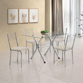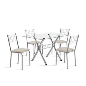 Este conjunto é composto pela Base Montana Cromada, o Tampo de Vidro Temperado Kanon Multi e as Cadeiras Íris em Corino, garantindo um visual harmonioso e de alta qualidade.