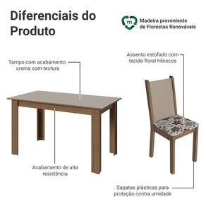 A mesa apresenta uma estrutura no tom amadeirado rustic, que transmite aconchego ao ambiente. O tampo no tom crema destaca o design do conjunto com um visual moderno e equilibrado, contribuindo para um ambiente mais leve e elegante.