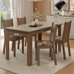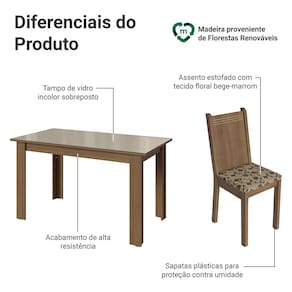 A mesa acomoda até quatro pessoas, sendo ideal para cozinhas e salas de jantar compactas. O tampo com vidro incolor sobreposto valoriza o ambiente, traz um toque mais sofisticado ao conjunto e ainda facilita a limpeza.