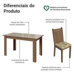 A mesa acomoda até quatro pessoas, sendo ideal para cozinhas e salas de jantar compactas. O tampo com vidro incolor sobreposto valoriza o ambiente, traz um toque mais sofisticado ao conjunto e ainda facilita a limpeza.