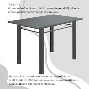 O Conjunto Sala de Jantar Bahia é uma ótima escolha para quem busca combinar estilo e praticidade. Este conjunto apresenta uma mesa retangular com um design elegante e moderno, acompanhada por quatro cadeiras. A mesa tem uma estrutura tubular de 3", que oferece estabilidade ao conjunto. O tampo de madeira MDP grafite não apenas adiciona um toque de sofisticação, mas também oferece durabilidade e resistência às atividades cotidianas. Sua tonalidade grafite é versátil e se adapta facilmente a uma variedade de estilos de decoração. As quatro cadeiras incluídas no conjunto apresentam um design que combina harmoniosamente com a mesa. Seu conforto é garantido pelo estofamento e pelo assento anatômico. O conjunto Bahia se adapta bem a diferentes espaços.