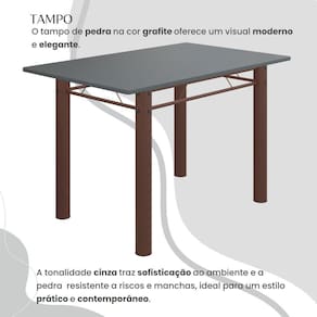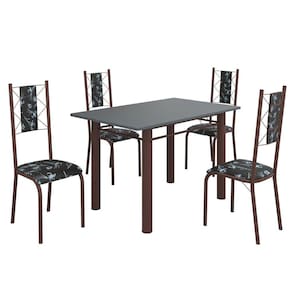 O Conjunto Sala de Jantar Bahia é uma ótima escolha para quem busca combinar estilo e praticidade. Ele apresenta uma mesa retangular com um design elegante e moderno, acompanhada por quatro cadeiras. A mesa tem uma estrutura tubular de 3", que oferece estabilidade ao conjunto. O tampo em pedra grafite oferece um visual moderno e sofisticado. A tonalidade do grafite confere elegância e versatilidade ao ambiente, enquanto a pedra proporciona durabilidade e resistência a riscos e manchas. Essa combinação de estética e funcionalidade cria um aspecto contemporâneo e prático, tornando o tampo em pedra grafite uma escolha marcante para adicionar estilo e resistência à sua sala de jantar. As quatro cadeiras incluídas no conjunto apresentam um design que combina harmoniosamente com a mesa. Acabamento da Cadeira/Banco: Pintura Texturizada Acabamento da Mesa: Pintura UV Acompanha Manual de Instalação: Sim Almofada do assento: Fixa Almofada do encosto: Fixa Ambiente Principal: Sala de Jantar Cadeira/Banco estofada: Sim Cadeira/Banco suporta até: 120 Complexidade da Montagem: Média: pode ser montado por mais de uma pessoa e/ou necessite de maior conhecimento para montagem Cor: Preto Floral/Marrom Cor do Produto: Preto Floral/Marrom Cor do Tampo: Cinza De Canto (Canto Alemão): Não Enchimento do Assento: Espuma D-12 Enchimento do Encosto: Espuma D-12 Escala de Brilho: Semi-Fosco Espessura do Tampo: 18 Estrutura do Assento: Aço Estrutura do Encosto: MDP de 15mm, espuma 1,2mm, courino, ferro 4,5. Formato do Tampo: Retangular Itens Inclusos: 1 Mesa, 4 Cadeiras, Kit Ferragens e Manual de Montagem Linha ou Coleção: Bahia Manual de Montagem e Instalação: https://cdn2.madeiramadeira.com.br/atributo/moveis-teixeira/1495440-cadeira-bahia-tampo-pedra.pdf Material da Base da Mesa: Aço Material da Estrutura da Cadeira: Aço Material Principal das Cadeiras/Bancos: Aço Medida da Base (A x L x P): 75,5cm x 65cm x 85,5cm Medida da Cadeira/Banco (A x L x P): 100cm x 36cm x 52cm Medida da Mesa (A x L x P): 75cm x 120cm x 75cm Medida do Tampo (L x C x E): 120cm x 75cm x 1,8cm Mesa Dobrável: Não Mesa Extensível: Não Mesa suporta até: 8 Necessita Montagem: Sim Origem do Produto: Nacional Peso da Cadeira/Banco: 3.04 Peso da Mesa: 49.76 Possui Apoio para Braços: Não Possui Apoio Para os Pés: Não Possui Prateleiras: Não Possui Rodízio: Não Possui Suporte Giratório: Não Possui Vidro: Não Quantidade de Cadeiras: 4 Recomendações de Uso, Manutenção e Limpeza: Usar um pano de tecido macio e seco, evitar detergentes, alvejantes e produtos químicos de limpeza; no tampo usar tecido macio levemente umedecido. Revestimento da Cadeira/Banco: Courino Sistema de Montagem: Parafusos Tipo de Assento: Fixo Tipo de Encosto: Estofado Ean: 7909903410547