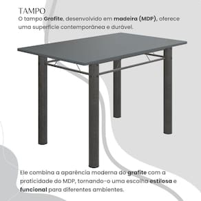 O Conjunto Sala de Jantar Bahia é uma ótima escolha para quem busca combinar estilo e praticidade. Este conjunto apresenta uma mesa retangular com um design elegante e moderno, acompanhada por seis cadeiras. A mesa tem uma estrutura tubular de 3", que oferece estabilidade ao conjunto. O tampo de madeira MDP grafite não apenas adiciona um toque de sofisticação, mas também oferece durabilidade e resistência às atividades cotidianas. Sua tonalidade grafite é versátil e se adapta facilmente a uma variedade de estilos de decoração. As seis cadeiras incluídas no conjunto apresentam um design que combina harmoniosamente com a mesa. Seu conforto é garantido pelo estofamento e pelo assento anatômico. O conjunto Bahia se adapta bem a diferentes espaços. Ideal para receber convidados.
