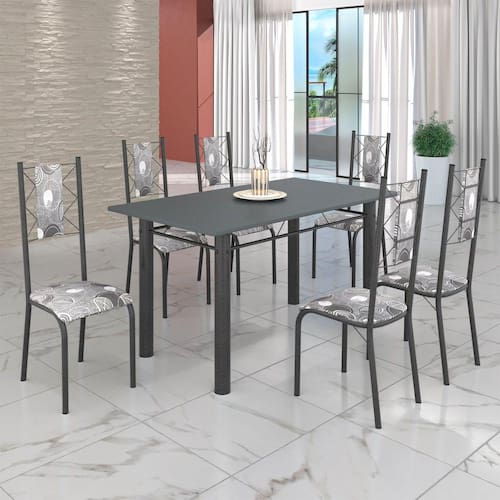 O Conjunto Sala de Jantar Bahia é uma ótima escolha para quem busca combinar estilo e praticidade. Este conjunto apresenta uma mesa retangular com um design elegante e moderno, acompanhada por seis cadeiras. A mesa tem uma estrutura tubular de 3", que oferece estabilidade ao conjunto. O tampo em pedra grafite oferece um visual moderno e sofisticado. A tonalidade do grafite confere elegância e versatilidade ao ambiente, enquanto a pedra proporciona durabilidade e resistência a riscos e manchas. Essa combinação de estética e funcionalidade cria um aspecto contemporâneo e prático, tornando o tampo em pedra grafite uma escolha marcante para adicionar estilo e resistência à sua sala de jantar. As seis cadeiras incluídas no conjunto apresentam um design que combina harmoniosamente com a mesa.