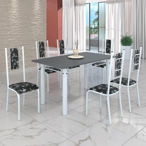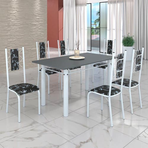 O Conjunto Sala de Jantar Bahia é uma ótima escolha para quem busca combinar estilo e praticidade. Este conjunto apresenta uma mesa retangular com um design elegante e moderno, acompanhada por seis cadeiras. A mesa tem uma estrutura tubular de 3", que oferece estabilidade ao conjunto. O tampo em pedra grafite oferece um visual moderno e sofisticado. A tonalidade do grafite confere elegância e versatilidade ao ambiente, enquanto a pedra proporciona durabilidade e resistência a riscos e manchas. Essa combinação de estética e funcionalidade cria um aspecto contemporâneo e prático, tornando o tampo em pedra grafite uma escolha marcante para adicionar estilo e resistência à sua sala de jantar. As seis cadeiras incluídas no conjunto apresentam um design que combina harmoniosamente com a mesa. Acabamento da Cadeira/Banco: Pintura Texturizada Acabamento da Mesa: Pintura Texturizada Acompanha Manual de Instalação: Sim Almofada do assento: Fixa Ambiente Principal: Sala de Jantar Cadeira/Banco estofada: Sim Cadeira/Banco suporta até: 120 Complexidade da Montagem: Média: pode ser montado por mais de uma pessoa e/ou necessite de maior conhecimento para montagem Cor: Preto Floral/Branco Cor do Produto: Preto Floral/Branco Enchimento do Assento: Espuma D-12 Escala de Brilho: Semi-Fosco Espessura do Tampo: 18 Estrutura do Assento: Assento em MDP de 15mm c/ courino. Formato do Tampo: Retangular Itens Inclusos: 1 Mesa, 6 Cadeiras, Kit Ferragens e Manual de Montagem Linha ou Coleção: Bahia Manual de Montagem e Instalação: https://cdn2.madeiramadeira.com.br/atributo/moveis-teixeira/1515347-base-3-1-40-pedra.pdf Material da Base da Mesa: Aço Material da Estrutura da Cadeira: Aço Material Principal das Cadeiras/Bancos: Aço Medida da Base (A x L x P): 75,5cm x 65cm x 112cm Medida da Cadeira/Banco (A x L x P): 100cm x 36cm x 52cm Medida da Mesa (A x L x P): 75cm x 140cm x 75cm Medida do Tampo (L x C x E): 140cm x 75cm x 1,8cm Mesa suporta até: 8 Necessita Montagem: Sim Origem do Produto: Nacional Peso da Cadeira/Banco: 3.04 Peso da Mesa: 57.4 Possui Apoio para Braços: Não Possui Apoio Para os Pés: Não Possui Rodízio: Não Possui Suporte Giratório: Não Quantidade de Cadeiras: 6 Recomendações de Uso, Manutenção e Limpeza: Usar um pano de tecido macio e seco, evitar detergentes, alvejantes e produtos químicos de limpeza; no tampo usar tecido macio levemente umedecido. Revestimento da Cadeira/Banco: Courino Sistema de Montagem: Parafusos Tipo de Assento: Fixo Tipo de Encosto: Estofado Ean: 7909903412084