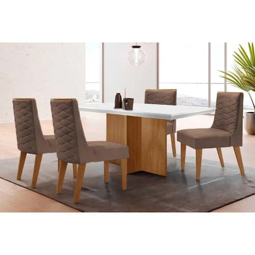 Sala de Jantar Completa Berlim c/ Tampo Madeirado c/ Vidro Canto Curvo 120x80cm e 4 Cadeiras Dafne Madeira Maciça Naturale/Off White - Capuccino/Corano Capuccino - Rufato