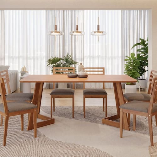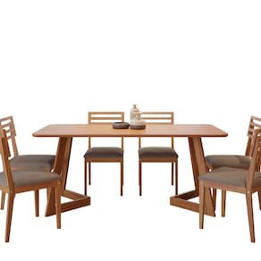 A mesa Caju é a escolha ideal para quem busca unir design contemporâneo, conforto e elegância em um único ambiente. Ideal para reunir a família ou receber convidados com estilo, esse conjunto eleva o nível da sua sala de jantar com charme, aconchego e personalidade. A Cadeira Juparanã traduz a essência do design funcional aliado à beleza da madeira natural. Com estrutura robusta em madeira de eucalipto e encosto ripado totalmente em madeira, oferece um visual limpo, leve e atemporal. O assento conta com espuma de alta densidade, garantindo conforto superior para o uso diário em salas de jantar e ambientes coletivos. Medida da Mesa (A x L x P): 77x180x90 Peso da Mesa: 40,5 kg Mesa suporta até: 40 kg Acabamento da Cadeira/Banco: Verniz Natural Acabamento da Mesa: Verniz Almofada do assento: Fixa Ambiente Principal: Sala de Jantar Cadeira/Banco Estofada: Somente Assento Estofado Cadeira/Banco estofada: Somente Assento Estofado Cadeira/Banco Suporta Até: 100.0000 Cadeira/Banco suporta até: 100 kg codigo_ean: 7908460019330 Complexidade da Montagem: Baixa: pode ser montado por uma pessoa sozinha Cor: Cinamomo/ Grafite Cor do Produto: Cinamomo/ Grafite Cor do Tampo: Marrom Cor Flex: Não Cor Secundária: Marrom De Canto (Canto Alemão): Não Escala de Brilho: Semi-Brilho Espessura do Tampo: 25 mm Formato do Tampo: Retangular Itens Inclusos: 1 Mesa, 6 Cadeiras, Kit Ferragem e Manual de Montagem Linha ou Coleção: Juparanã/Caju Manual de Montagem e Instalação: https://product-hub-prd.madeiramadeira.com.br/717147624/documents/0fba7e49-32d4-4b92-86b3-e0b0e81d34e63146446503517556129276015.pdf Marca: Cimol Material da Base da Mesa: Madeira Maciça Material da Estrutura da Cadeira: Madeira Maciça Material do Tampo: MDF Medida da Cadeira/Banco (A x L x P): 88,3x43,7x52,8 Medida do Tampo (L x C x E): 90x180x2,5 Mesa Extensível: Não Montagem Flex: Não Necessita Montagem: Sim Origem do Produto: Nacional Peso da Cadeira/Banco: 10 kg Possui Apoio para Braços: Não Possui Apoio Para os Pés: Não Quantidade de Cadeiras: 6 Quantidade de Lugares: 06 Recomendações de Uso, Manutenção e Limpeza: Para manter seu móvel novo por muito mais tempo, evite locais úmidos, mantenha-o distante de líquidos. Para limpá-lo com segurança utilize uma flanela seca sem produtos abrasivos Sistema de Montagem: Parafusos, anel fixador e cantoneiras Tipo de Madeira Maciça da Base da Mesa: Eucalipto