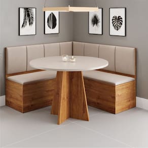 Conjunto Sala de Jantar Canto Alemão Liebe com Mesa Fin é a escolha perfeita para transformar sua cozinha ou sala de jantar com charme, funcionalidade e conforto. Com design inteligente, ele é ideal para ambientes compactos que não abrem mão da elegância. O canto possui baú interno, oferecendo praticidade e espaço extra para organização. Os assentos são acolchoados e revestidos em veludo, proporcionando um toque macio e visual sofisticado. A mesa é feita com materiais de alta qualidade, garante durabilidade e estabilidade, tornando-a uma escolha ideal para cozinhas e salas de jantar com estilo e funcionalidade. O tampo em MDF oferece durabilidade e qualidade no acabamento, enquanto a pintura proporciona um visual moderno e sofisticado ao ambiente.