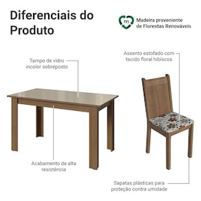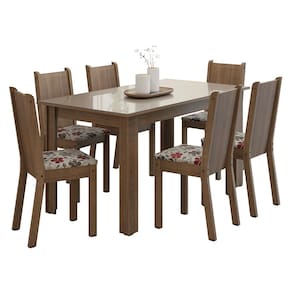 A mesa retangular acomoda até seis pessoas. O tampo de madeira com vidro incolor sobreposto e acabamento crema valoriza o conjunto e traz um aspecto elegante.