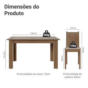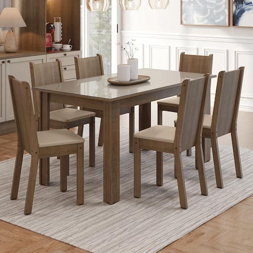 O acabamento da mesa nos tons amadeirado Rustic e Crema combinado com o revestimento sintético bege nas cadeiras forma uma composição neutra. Essa versão é ideal para combinar com diferentes estilos de decoração.