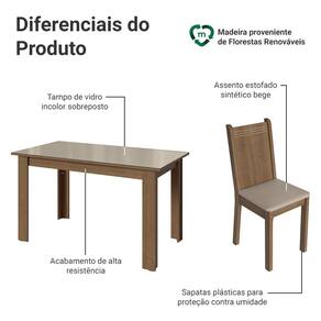 A mesa retangular acomoda até seis pessoas. O tampo de madeira com vidro incolor sobreposto e acabamento crema valoriza o conjunto e traz um aspecto elegante.