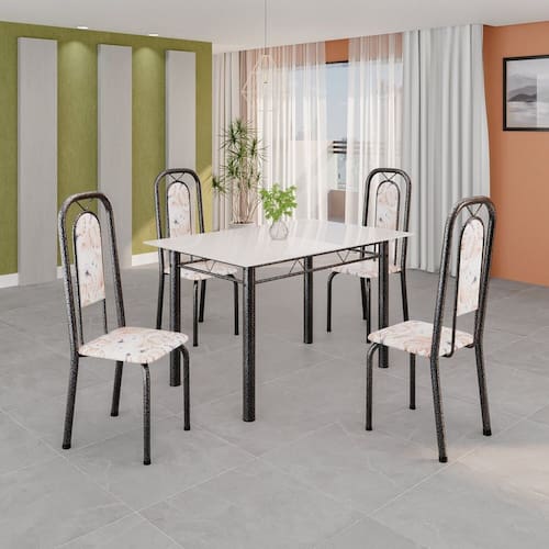 Quer deixar sua casa completa e prática? Uma dica bacana de como transformar o seu lar, deixando-o mais receptivo e bonito? Então você precisa de móveis indispensáveis para deixar seu lar muito mais aconchegante, receptivo e sempre disponível para receber a visita de amigos, familiares e convidados. Você vai se apaixonar por este incrível e moderno Conjunto de Mesa com 4 Cadeiras. Ideal para cozinha, ele é a melhor opção para completar o espaço que você desejar. Aproveite!! Medida da Mesa (A x L x P): 75,8 cm x 120 cm x 75 cm Peso da Mesa: 19,15 kg Mesa suporta até: 10.0000 Acabamento da Cadeira/Banco: Pintura Texturizada Acabamento da Mesa: Pintura Texturizada Ambiente Principal: Cozinha Cadeira/Banco Estofada: Encosto e Assento Estofados Cadeira/Banco estofada: Encosto e Assento Estofados Cadeira/Banco suporta até: 120.0000 codigo_ean: 7900288145260 Complexidade da Montagem: Baixa: pode ser montado por uma pessoa sozinha Cor: Bege / Prata Cor do Produto: Bege / Prata Cor Secundária: Bege De Canto (Canto Alemão): Não Enchimento do Assento: Espuma D-16 Escala de Brilho: Brilhante Espessura do Tampo: 6 mm Espessura do Vidro: 6 mm Estrutura do Assento: MDP Formato do Tampo: Retangular Itens Inclusos: 1 Mesa, 4 Cadeiras, Manual de Montagem e Kit Ferragens Linha ou Coleção: Lara Manual de Montagem e Instalação: https://product-hub-prd.madeiramadeira.com.br/939263209/documents/c8ea1c71-096e-4344-9065-7db7b713c44192818001352817441405246925.pdf Marca: Soma Móveis Material da Base da Mesa: Aço Material da Estrutura da Cadeira: Aço Material do Tampo: Vidro Medida da Cadeira/Banco (A x L x P): 105 cm x 37 cm x 40 cm Medida do Tampo (L x C x E): 120cm x 75cm x 0,6 cm Mesa Extensível: Não Necessita Montagem: Sim Origem do Produto: Nacional Peso da Cadeira/Banco: 2,7 kg Possui Apoio Para os Pés: Não Quantidade de Cadeiras: 4 Quantidade de Lugares: 04 Recomendações de Uso, Manutenção e Limpeza: Não permitir que molhe os pés da base, usar um pano de tecido macio e seco, evitar detergentes, alvejantes e produtos químicos de limpeza; no tampo usar tecido macio levemente umedecido. Revestimento da Cadeira/Banco: Couro Ecológico Sistema de Montagem: Parafusos Vidro Temperado: Sim