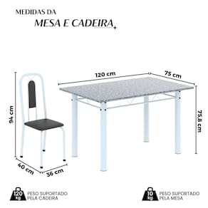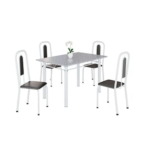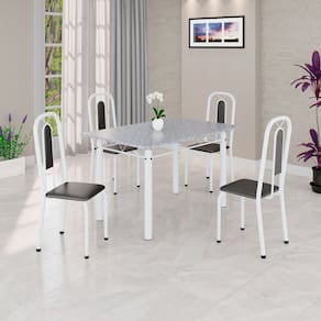 Quer deixar sua casa completa e prática? Uma dica bacana de como transformar o seu lar, deixando-o mais receptivo e bonito? Então você precisa de móveis indispensáveis para deixar seu lar muito mais aconchegante, receptivo e sempre disponível para receber a visita de amigos, familiares e convidados. Você vai se apaixonar por este incrível e moderno Conjunto de Mesa com 4 Cadeiras. Ideal para cozinha, ele é a melhor opção para completar o espaço que você desejar. Aproveite!! Medida da Mesa (A x L x P): 75,8 cm x 120 cm x 75 cm Peso da Mesa: 57,08 kg Mesa suporta até: 10.0000 Acabamento da Cadeira/Banco: Pintura Texturizada Acabamento da Mesa: Pintura Texturizada Ambiente Principal: Cozinha Cadeira/Banco Estofada: Encosto e Assento Estofados Cadeira/Banco estofada: Encosto e Assento Estofados Cadeira/Banco suporta até: 120.0000 codigo_ean: 7900288147912 Complexidade da Montagem: Baixa: pode ser montado por uma pessoa sozinha Cor: Preto / Branco Cor do Produto: Preto / Branco Cor Secundária: Cinza De Canto (Canto Alemão): Não Enchimento do Assento: Espuma D-16 Escala de Brilho: Semi-Brilho Espessura do Tampo: 1,5 mm Estrutura do Assento: MDP Formato do Tampo: Retangular Itens Inclusos: 1 Mesa, 4 Cadeiras, Kit Ferragens e Manual de Montagem Linha ou Coleção: Lívia Manual de Montagem e Instalação: https://product-hub-prd.madeiramadeira.com.br/235605978/documents/3d8f9606-1c36-4ff5-bfc6-3ab37ba03754d2741541352817418186330048.pdf Marca: Soma Móveis Material da Base da Mesa: Aço Material da Estrutura da Cadeira: Aço Material do Tampo: Granito Medida da Cadeira/Banco (A x L x P): 94 cm x 36 cm x 40 cm Medida do Tampo (L x C x E): 120cm x 75cm x 1,5 cm Mesa Extensível: Não Necessita Montagem: Sim Origem do Produto: Nacional Peso da Cadeira/Banco: 2,28 kg Possui Apoio Para os Pés: Não Quantidade de Cadeiras: 4 Quantidade de Lugares: 04 Recomendações de Uso, Manutenção e Limpeza: Não permitir que molhe os pés da base, usar um pano de tecido macio e seco, evitar detergentes, alvejantes e produtos químicos de limpeza; no tampo usar tecido macio levemente umedecido. Revestimento da Cadeira/Banco: Couro Ecológico Sistema de Montagem: Parafusos