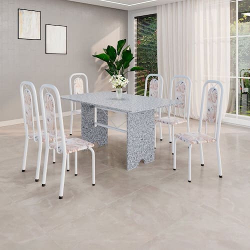 Quer deixar sua casa completa e prática? Uma dica bacana de como transformar o seu lar, deixando-o mais receptivo e bonito? Então você precisa de móveis indispensáveis para deixar seu lar muito mais aconchegante, receptivo e sempre disponível para receber a visita de amigos, familiares e convidados. Você vai se apaixonar por este incrível e moderno Conjunto de Mesa com 6 Cadeiras. Ideal para cozinha, ele é a melhor opção para completar o espaço que você desejar. Aproveite!! Medida da Mesa (A x L x P): 75,8 cm x 140 cm x 75 cm Peso da Mesa: 84,06 kg Mesa suporta até: 10.0000 Acabamento da Cadeira/Banco: Pintura Texturizada Acabamento da Mesa: Pintura Texturizada Ambiente Principal: Cozinha Cadeira/Banco Estofada: Encosto e Assento Estofados Cadeira/Banco estofada: Encosto e Assento Estofados Cadeira/Banco suporta até: 120.0000 codigo_ean: 7900288148452 Complexidade da Montagem: Baixa: pode ser montado por uma pessoa sozinha Cor: Bege / Branco Cor do Produto: Bege / Branco Cor Secundária: Bege De Canto (Canto Alemão): Não Enchimento do Assento: Espuma D-16 Escala de Brilho: Brilhante Espessura do Tampo: 1,5 mm Estrutura do Assento: MDP Formato do Tampo: Retangular Itens Inclusos: 1 Mesa, 6 Cadeiras, Manual de Montagem e Kit Ferragens Linha ou Coleção: Lara Manual de Montagem e Instalação: https://product-hub-prd.madeiramadeira.com.br/305635132/documents/f1da961d-ec69-4e58-8fb4-c4cc13b2d0d9d5282371535281744235397937.pdf Marca: Soma Móveis Material da Base da Mesa: Aço Material da Estrutura da Cadeira: Aço Material do Tampo: Granito Medida da Cadeira/Banco (A x L x P): 105 cm x 37 cm x 40 cm Medida do Tampo (L x C x E): 140cm x 75cm x 1,5 cm Mesa Extensível: Não Necessita Montagem: Sim Origem do Produto: Nacional Peso da Cadeira/Banco: 2,7 kg Possui Apoio Para os Pés: Não Possui Suporte Giratório: Não Quantidade de Cadeiras: 6 Quantidade de Lugares: 06 Recomendações de Uso, Manutenção e Limpeza: Não permitir que molhe os pés da base, usar um pano de tecido macio e seco, evitar detergentes, alvejantes e produtos químicos de limpeza; no tampo usar tecido macio levemente umedecido. Revestimento da Cadeira/Banco: Couro Ecológico Sistema de Montagem: Parafusos