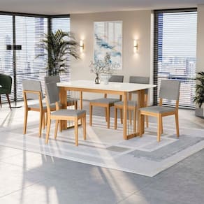 Para quem busca por modernidade e estilo, o Conjunto CSJ331CA da Linha Sala de Jantar Premium Kappesberg vai conquistar o seu espaço. Com design moderno, a base é robusta e resistente, produzida em madeira de eucalipto, garante maior durabilidade, além de uma beleza única. Com formato retangular, o destaque fica para o detalhe das cordas nas laterais, proporcionando um acabamento leve e moderno. Medindo 76,5cm de altura, 134,5cm de largura e 59cm de profundidade, ela é perfeita para todos os ambientes, e quando combinada ao tampo, acomoda até seis pessoas. Em MDF de 30mm, o tampo é na cor off white, com destaque para o vidro na mesma cor, garantindo um acabamento único e moderno à composição, além de elegância ao espaço. Medindo 160cm x 90cm, suporta até 90kg e conta com bordas arredondadas. Já as cadeiras que compõem o conjunto, no modelo Dora, também em madeira de eucalipto, contam com assento e encosto desmontados, suportando até 120kg e combina com todos os momentos. Medindo 89cm de altura, sendo 47,5cm a altura do assento, 44cm de largura e 53cm de profundidade, para mais comodidade, ela possui assento e encosto estofados e recobertos com tecido boucle cinza, garantindo um toque suave e gostoso, proporcionando conforto em todos os momentos. O destaque fica para a estrutura atrás do encosto, que além de um acabamento lindo, facilita o manuseio, garantindo um acabamento único e deixando sua sala de jantar espaço ainda mais completa. Renove e transforme seu espaço com o Conjunto de Mesa da Sala de Jantar Premium Kappesberg. Medidas: - 83 cm de altura - 160 cm de largura - 90 cm de profundidade Itens inclusos: - Uma (1) mesa em Madeira Maciça - Seis (6) Cadeiras em Madeira Maciça - Estrutura em MDF Código do produto: CSJ331CA-A056 Informações importantes: - As imagens são ilustrativas. - A Kappesberg não disponibiliza serviço de montagem (recomendamos a contratação de um profissional qualificado). - O manual de montagem acompanha o produto. - 3 meses de garantia para defeitos de fabricação. Cor: Boucle Cinza | Garantia: 3 meses para defeito de fabricação | Matéria-prima: MDF | Peso máximo suportado: 90 Kg | Quantidade de cadeiras: 6 | Montagem: Necessita montagem | Quantidade de caixas de embalagem: 3 | Inclui manual de montagem: Sim | Duração da garantia: 3 meses | Requer montagem: Sim | Tipo de garantia: Garantia do fabricante