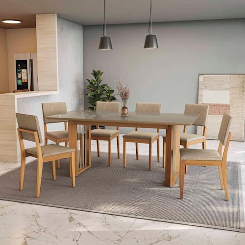 O destaque fica para a estrutura atrás do encosto, que além de um acabamento lindo, facilita o manuseio, garantindo um acabamento único e deixando sua sala de jantar espaço ainda mais completa. Renove e transforme seu espaço com o Conjunto de Mesa da Sala de Jantar Premium Kappesberg.