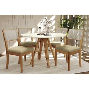 Sala de Jantar Completa Duna Premium Madeira Maciça c/ Tampo Madeirado c/ Vidro 120x120cm e 4 Cadeiras Lola Carvalho/Off White - Boucle Bege - Kappesberg