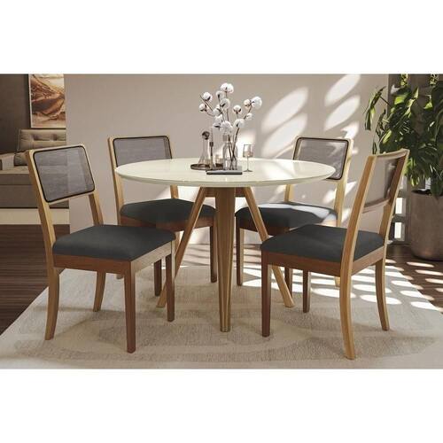 Sala de Jantar Completa Duna Premium Madeira Maciça c/ Tampo Madeirado c/ Vidro 120x120cm e 4 Cadeiras Lola Carvalho/Off White - Boucle Grafite - Kappesberg