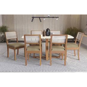 Sala de Jantar Completa Elma Premium Madeira Maciça c/ Tampo Madeirado c/ Vidro 170x90cm e 6 Cadeiras Lola Carvalho/Off White - Boucle Bege Fendi - Kappesberg