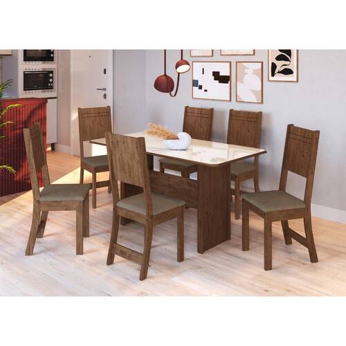 Renove sua sala de jantar com o Conjunto Fidelitá Atenas 150cm, que combina elegância, resistência e conforto em cada detalhe. Com mesa espaçosa e seis cadeiras com assento estofado, este conjunto é perfeito para reunir a família ou receber convidados com muito estilo. A combinação das cores Noce e Off-White, somada ao assento em tecido cacau, cria um ambiente moderno, acolhedor e sofisticado.