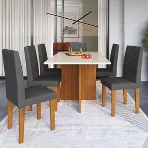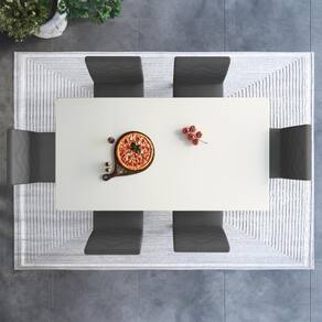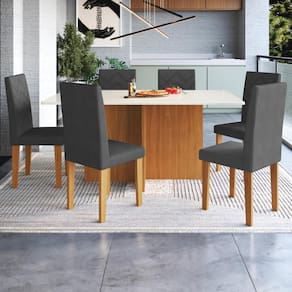 O Conjunto Sala De Jantar Itália da Fidelitá reúne características decorativas, linhas delicadas e práticas em seu design, a estrutura da mesa e cadeiras é diferenciado pela sua pintura em uv-ultravioleta em padrões amadeirados e o tampo em pintura Off-White. A de se destacar que as bordas do tampo da mesa são usinadas e trabalhadas em PU resultando num acabamento similar ao laqueado.