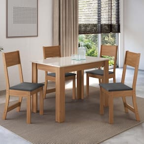 A mesa possui estrutura resistente em MDP de 15mm, acabamento na sofisticada cor Freijó/Off-white, e conta com tampo retangular que acomoda confortavelmente até quatro pessoas. Já as cadeiras combinam estrutura firme com assentos estofados e revestimento em tecido grafite, oferecendo conforto e resistência para o uso diário.