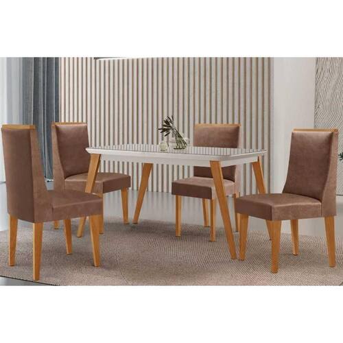 Sala de Jantar Completa Havana c/ Tampo Madeirado c/ Vidro Canto Curvo 120x80cm e 4 Cadeiras Dakota Madeira Maciça Naturale/Off White - Capuccino/Corano Capuccino - Rufato