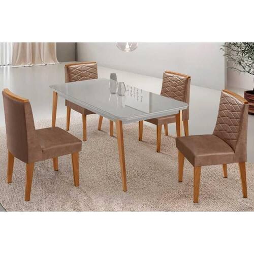 Sala de Jantar Completa Havana c/ Tampo Madeirado c/ Vidro Canto Curvo 120x80cm e 4 Cadeiras Maldivas Madeira Maciça Naturale/Off White - Capuccino/Corano Capuccino - Rufato