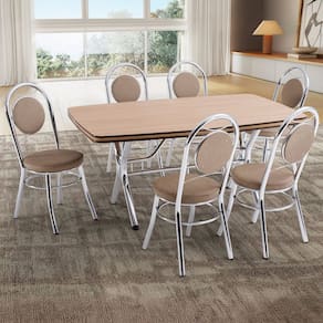 Ideal para quem busca funcionalidade e conforto, esse conjunto se adapta facilmente à sua sala de jantar, deixando qualquer espaço ainda mais charmoso. Medida da Mesa (A x L x P): 78 x 160 x 100 Peso da Mesa: 37 kg Mesa suporta até: 100.0000 Acabamento da Cadeira/Banco: Cromado Acabamento da Mesa: Cromado Acompanha Manual de Instalação: Sim Almofada do encosto: Fixa Ambiente Principal: Sala de Jantar Cadeira/Banco estofada: Encosto e Assento Estofados Cadeira/Banco Estofada: Encosto e Assento Estofados Cadeira/Banco suporta até: 120.0000 codigo_ean: 7900288093899 Complexidade da Montagem: Baixa: pode ser montado por uma pessoa sozinha Configuração do Conjunto: Mesa com Cadeiras Cor: Cromado/Amadeirado Claro/Café Cor da Base: Cromado Cor das Cadeiras: Bege Cor do Produto: Cromado/Amadeirado Claro/Café Cor do Tampo: Natural Cor Secundária: Cromado De Canto (Canto Alemão): Não Enchimento do Assento: Espuma D-23 Escala de Brilho: Semi-Brilho Espessura do Tampo: 45 mm Estrutura do Assento: Estofado Formato do Tampo: Retangular Itens Inclusos: 1 Mesa, 6 Cadeiras, 1 Kit Ferragens, 1 Manual de Montagem Manual de Montagem e Instalação: https://product-hub-prd.madeiramadeira.com.br/981974/documents/975b3fa3-0f81-4c3d-ad9e-70b0fd85ad832754657421717424752055632.pdf Marca: Móveis Brastubo Material da Base da Mesa: Aço Carbono Material da Estrutura da Cadeira: Aço Carbono Material do Tampo: MDP Material Principal das Cadeiras/Bancos: Aço Carbono Medida da Cadeira/Banco (A x L x P): 96 x 42 x 48 Medida do Tampo (L x C x E): 100 x 160 x 4,5 Mesa Dobrável: Não Mesa Extensível: Não Necessita Montagem: Sim Origem do Produto: Nacional Peso da Cadeira/Banco: 5,6 kg Possui Apoio para Braços: Não Possui Apoio Para os Pés: Não Possui Prateleiras: Não Possui Vidro: Não Quantidade de Cadeiras: 6 Quantidade de Lugares: 06 Recomendações de Uso, Manutenção e Limpeza: LIMPEZA APENAS COM PANO SECO, NÃO UTILIZAR PRODUTOS QUÍMICOS Revestimento da Cadeira/Banco: Courino Sistema de Montagem: Parafusos Tipo de Assento: Fixo Tipo de Encosto: Estofado