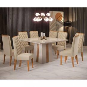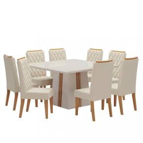Características: Conjunto com estrutura em MDF/MDP Tampo com espessura 25mm Tampo Suporta até 50 kg distribuídos Acabamento sem-brilho Pintura UV 8 cadeiras Assento em MDP e espuma D16 Encosto em MDF Cada cadeira suporta até 90 kg Revestimento em tecido veludo