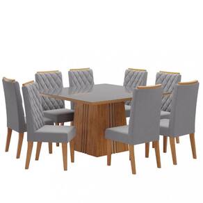 Características: Conjunto com estrutura em MDF/MDP Tampo com espessura 25mm Tampo Suporta até 50 kg distribuídos Acabamento sem-brilho Pintura UV 8 cadeiras Assento em MDP e espuma D16 Encosto em MDF Cada cadeira suporta até 90 kg Revestimento em tecido veludo
