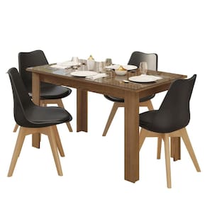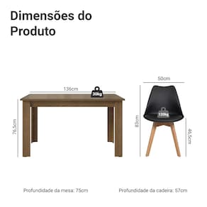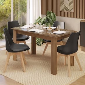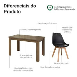 As cadeiras possuem encosto ergonômico proporcionando mais conforto e o assento revestido em material sintético preto facilita a limpeza. A base em madeira maciça com pés em estilo retrô completa o visual.