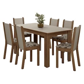 As cadeiras possuem assento com estampa floral em tons de bege e marrom, um detalhe que acrescenta charme e personalidade ao ambiente.