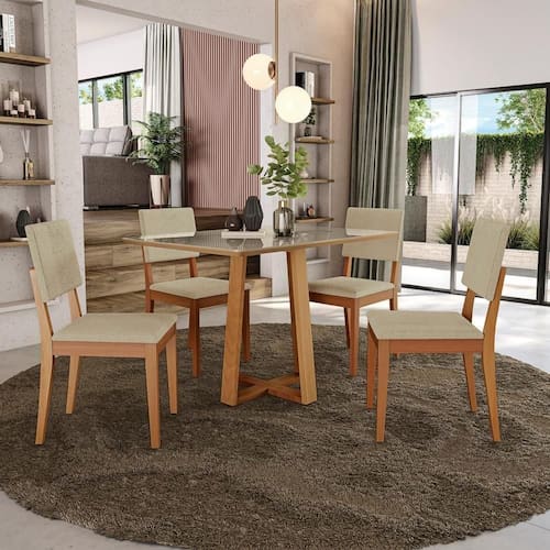E medindo 120cm de largura e 80cm de profundidade, deixará sua sala de jantar mais completa. Já as cadeiras que compõem o conjunto, quatro unidades do modelo Dora, também em madeira de eucalipto, conta com assento e encosto desmontados, suportando até 120kg e combinando com todos os momentos. Medindo 89cm de altura, sendo 47,5cm a altura do assento, 44cm de largura e 53cm de profundidade, para mais comodidade, elas possuem assento e encosto estofados com espumas certificadas e recobertos com tecido boucle bege, garantem um toque suave e gostoso, proporcionando conforto em todos os momentos.
